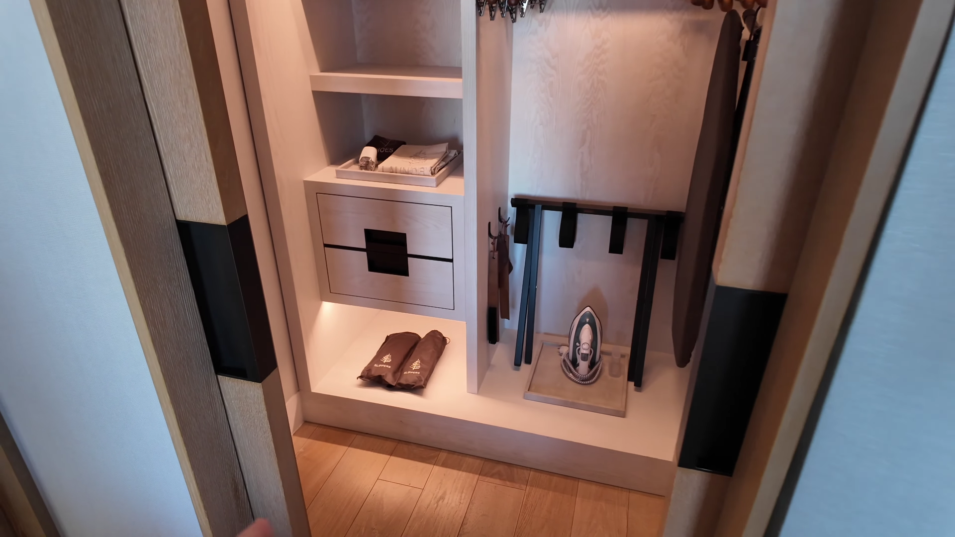 The closet can be closed off, which is a nice touch, but it is on the smaller side. A standard suitcase cannot be fully opened inside it, which means luggage ends up staying in the already compact room. Inside the closet: an iron and ironing board, shoehorn, slippers, a shoe bag, mosquito deterrent and laundry list.