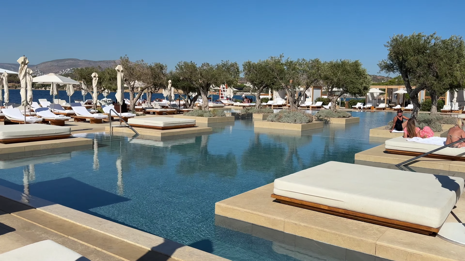 The private beach and the pool are the heart of this hotel, and they are exceptional. The adults-only pool is quiet, intimate, and surrounded by impeccably kept grounds with pine trees scenting the air. No music plays at the pool or beach. You hear only waves and nature, a choice we deeply appreciated and that feels increasingly rare. The beach itself is stunning with crystal clear water (and I say that as a beach snob), with beautiful seat covers on the chairs that wrap around the seat like an airline mattress pad, preventing the towel from slipping.