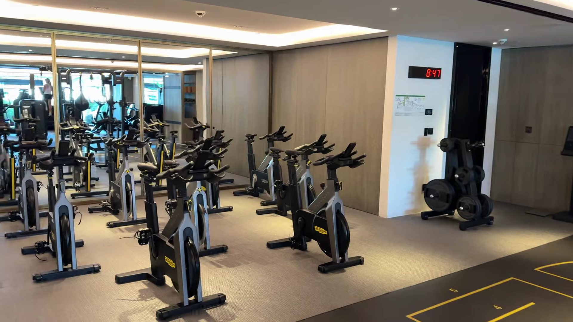 The gym is well equipped and receives a 4 out of 5. We initially entered the private fitness studio by mistake, which has yoga mats, a massage table, and is intended for private sessions. The actual gym includes weight training equipment, cardio machines, a whirlpool, sauna, steam room, and studio classes, accessible 24 hours. Very good for a resort property, though not quite at the level of the very best gym experiences we have reviewed.