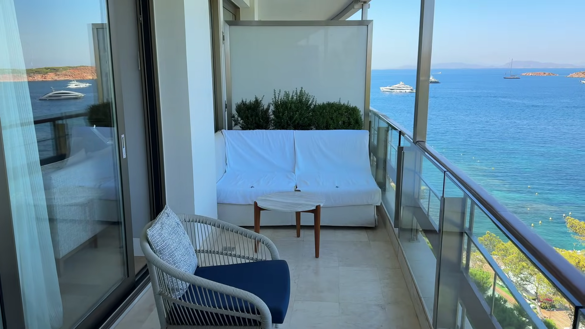 The balcony is almost the size of the room itself, and it re-frames the entire stay. Looking out over a private bay docked with yachts, with pine trees scenting the air, the view is breathtaking. Two loungers are set up and ready. It becomes immediately clear that the design philosophy of this hotel is to make the outdoors the primary living space, and the balcony makes that case convincingly. The compact room matters far less once you are out here.