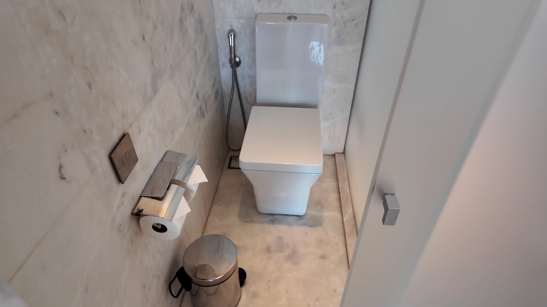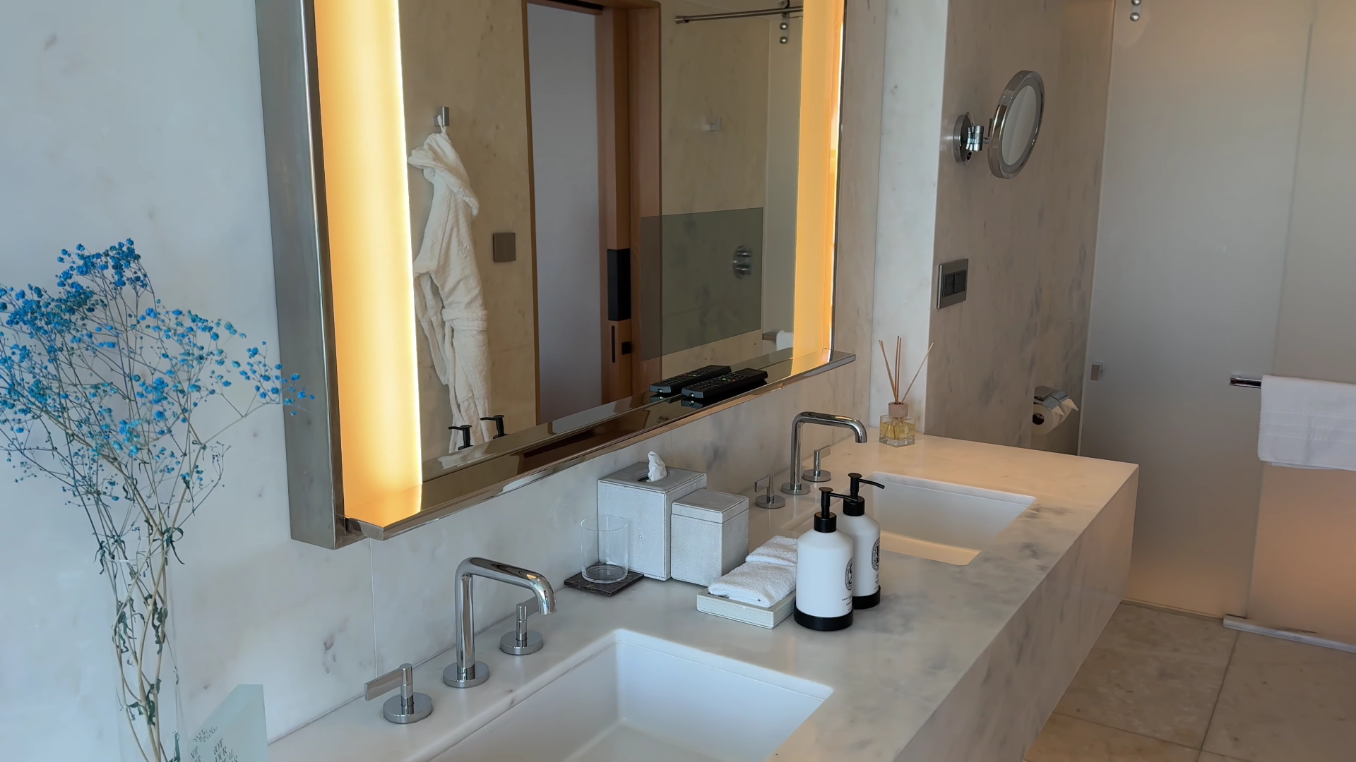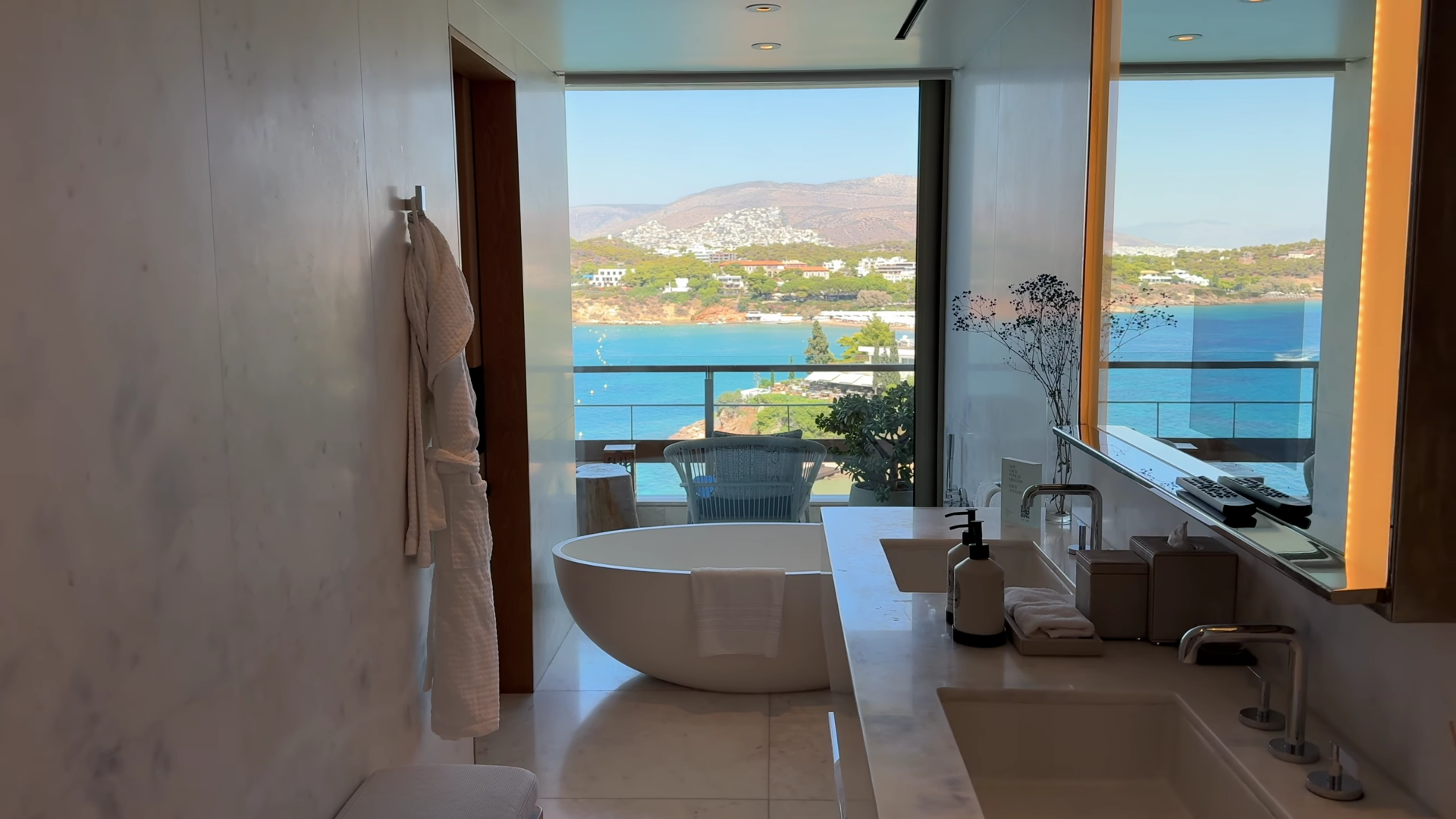 A beautiful marble bathroom scoring a 9 out of 10. The only reason it falls short of 10 is the layout: two people may need to squeeze past each other, which at this price point is noticeable. Otherwise, it is excellent. A gorgeous rainfall shower, a deep soaking bathtub with a breathtaking view, and double sinks with a mirror wide enough for two people. There is a toilet with a bum gun, which we always appreciate. The bath mats are luscious, and the bathrobes are hung one on each side of the bathroom, a logical touch. There is also a small bench and a scale.