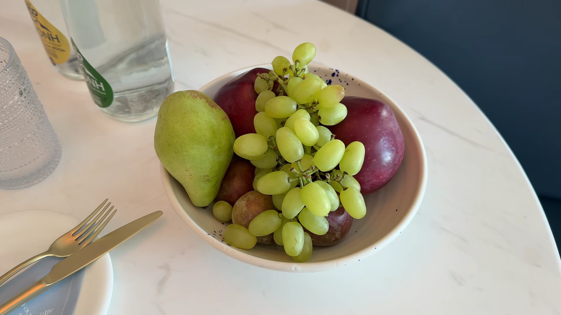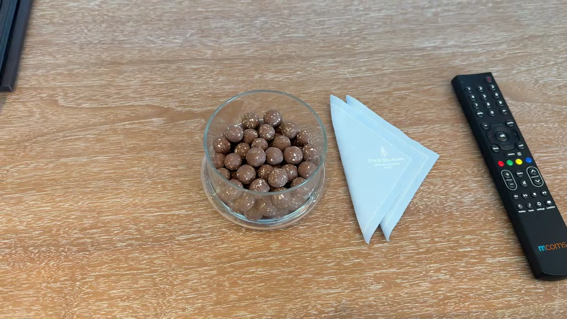 What the room does offer: a striking mirror TV that appears as a regular mirror until switched on and includes Chromecast, which is a welcome addition. Four Seasons stationery, a welcome bowl of fruit (pears, apples, grapes), water, chocolate-covered nuts, and a small table with two chairs, a welcome touch since a room for two guests with only one chair is a common frustration.