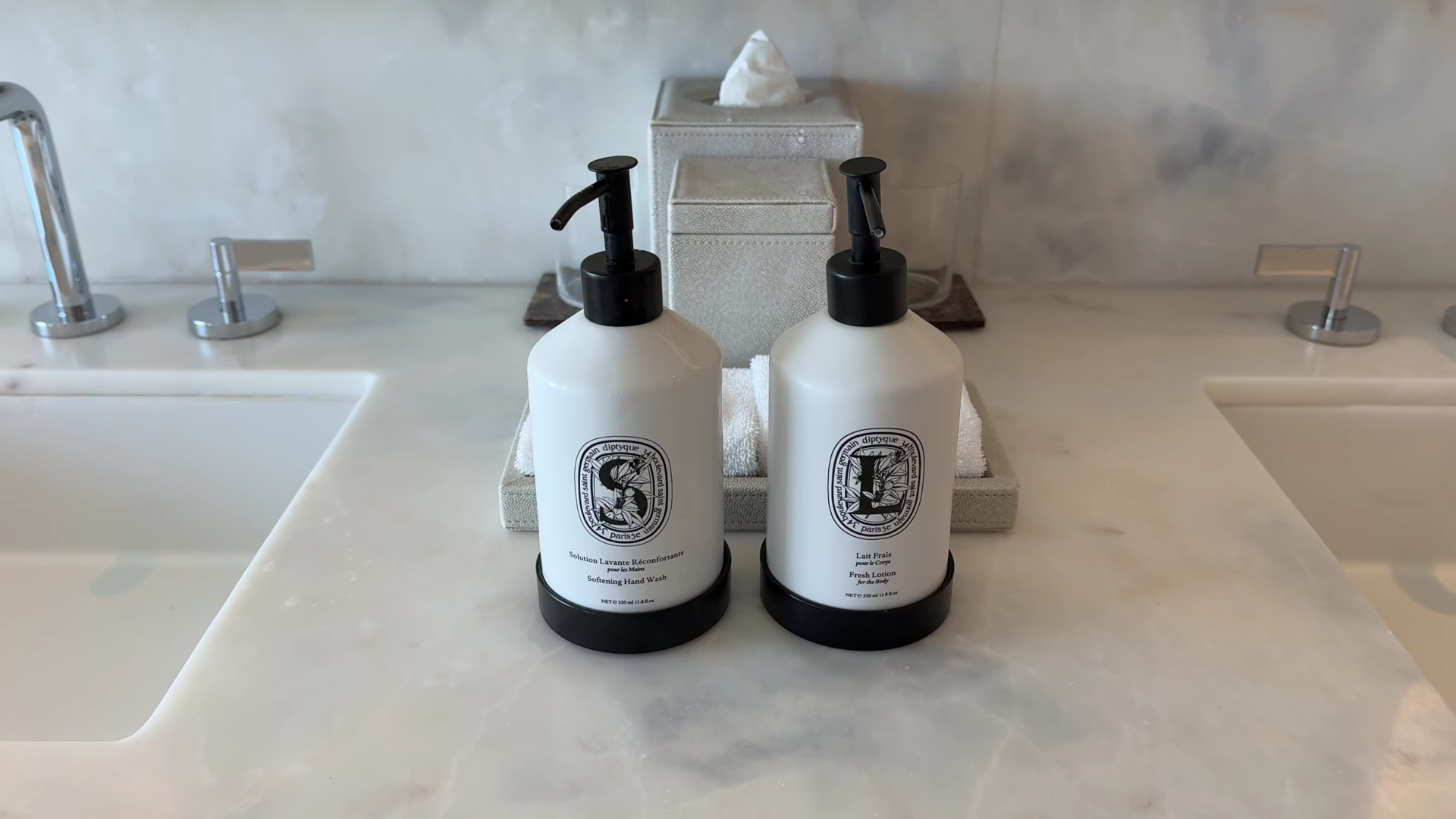 One layout quirk: the hand towels are positioned near only one sink, meaning a guest at the other sink has to walk across the bathroom to dry their hands.