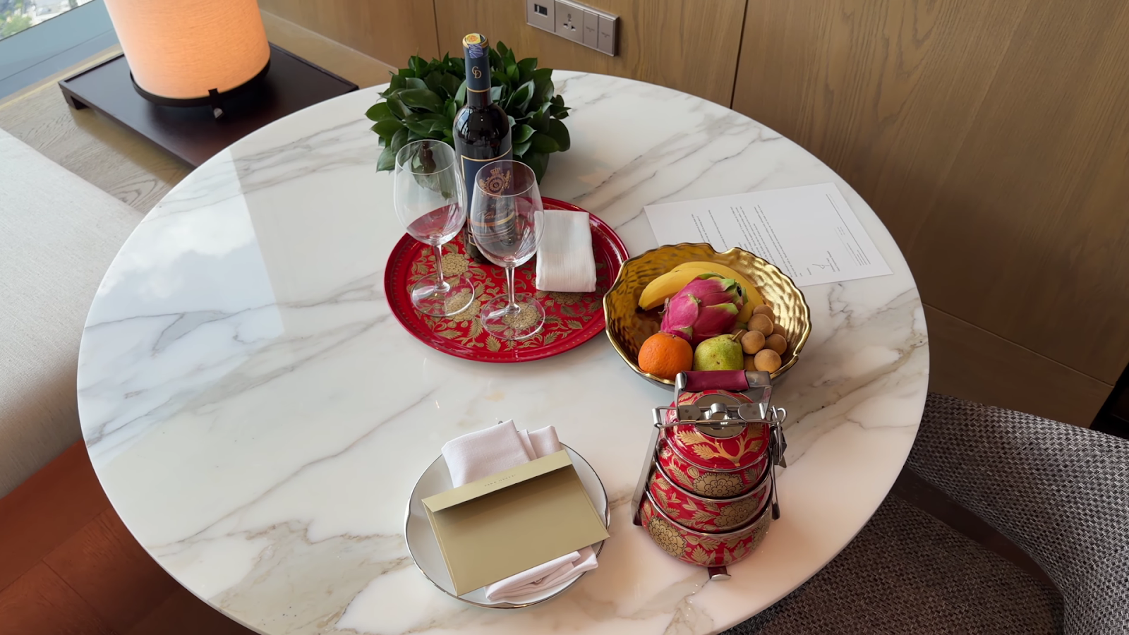 Check-in was warm and efficient. Staff greeted us with a hand on heart, a small but sincere gesture that set the tone for the stay. A handwritten letter from Christina at the front desk accompanied a welcome amenity box: longan fruit, banana, chocolate truffles, lapis (a traditional Malay layered cake), and curry puffs. We had emailed days in advance to request non-alcoholic welcome drinks, but a Clarendelle 2019 Médoc wine was served instead. A small miss, but the warmth of the overall arrival more than made up for it.