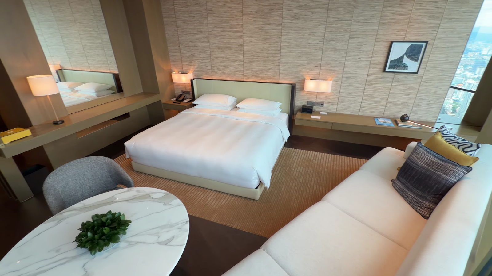 The floors are gorgeous dark wood throughout, with a gold-colored carpet just around the bed. A low headboard sits against a stunning feature wall that more than compensates for the headboard's modest height. There is a large flat-screen TV, a Bluetooth speaker with a deliberately textured rock-like aesthetic, and an almost excessive number of surfaces, large shelving areas, a substantial table, and a mirror facing the city. Some of these spaces feel slightly random without a chair nearby, but they contribute to a feeling of spaciousness and breathing room that makes the room feel even larger than it is.