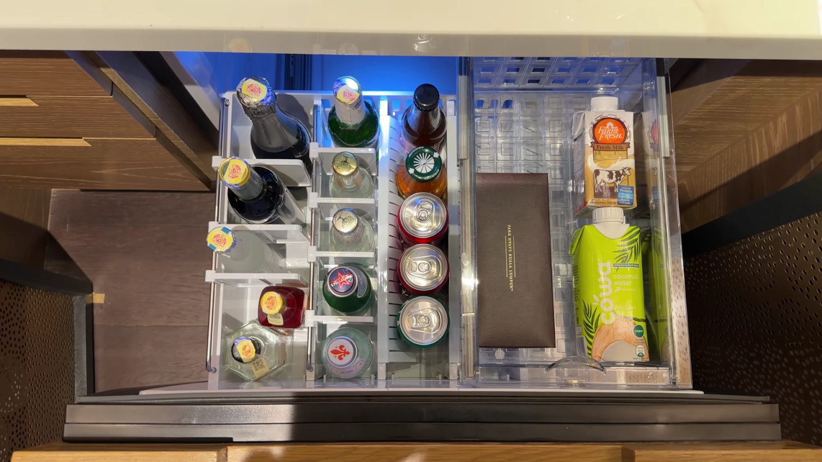 The minibar area includes a small espresso machine with pods of varying intensity (we noted both a 4 and an impressive intensity 13), Harney & Sons teas, coconut water, nuts, and complimentary Park Hyatt branded still water. Instead of cutlery, chopsticks are provided, a considered nod to the hotel's Japanese aesthetic.