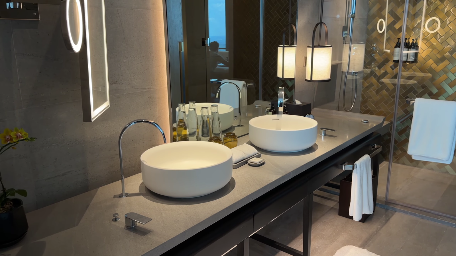 A 10 out of 10 bathroom. The hotel is less than one year old, and it shows: every surface is brand new. The marble is immaculate, the counter space is generous, and the layout feels almost decadently large. There are effectively three sinks across two bathroom spaces, starting with the Japanese toilet room off the closet (which has its own sink, though no soap or hand towels were provided there, a minor oddity).