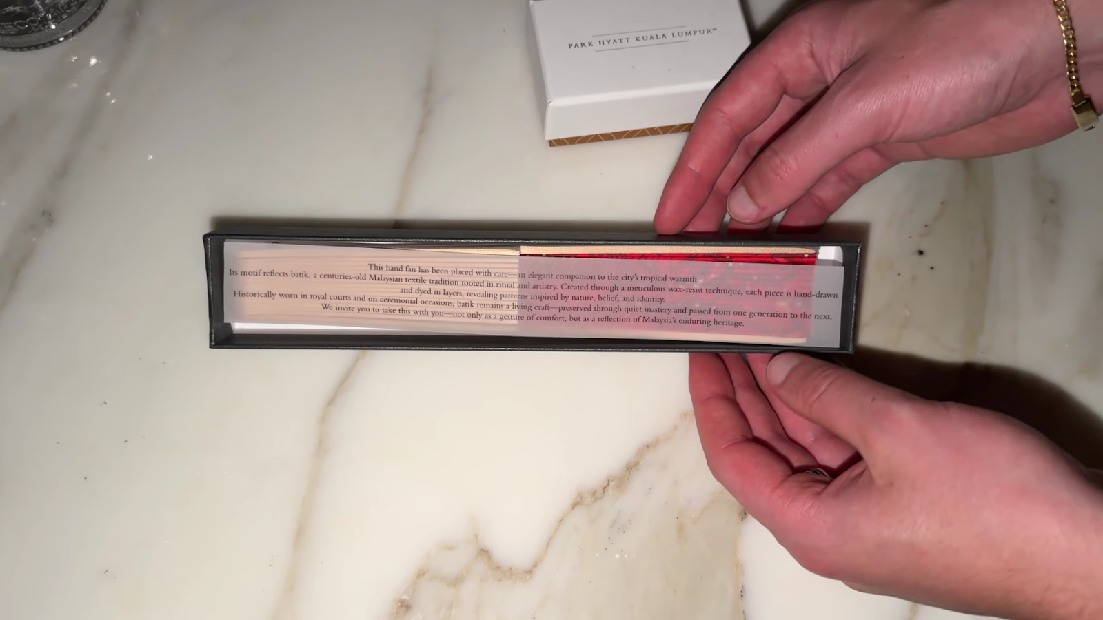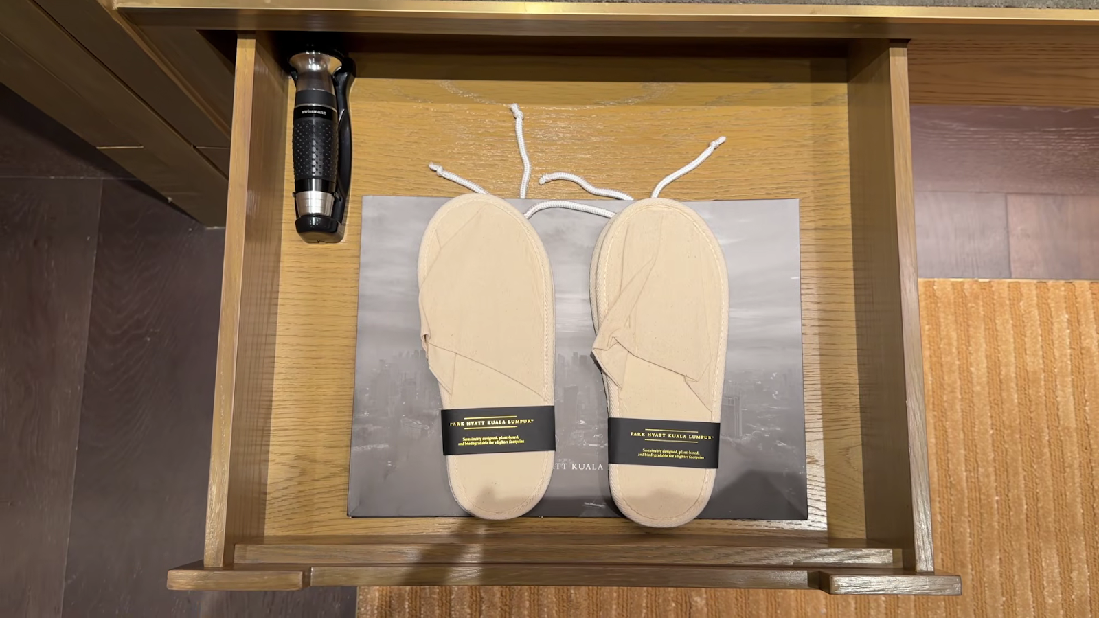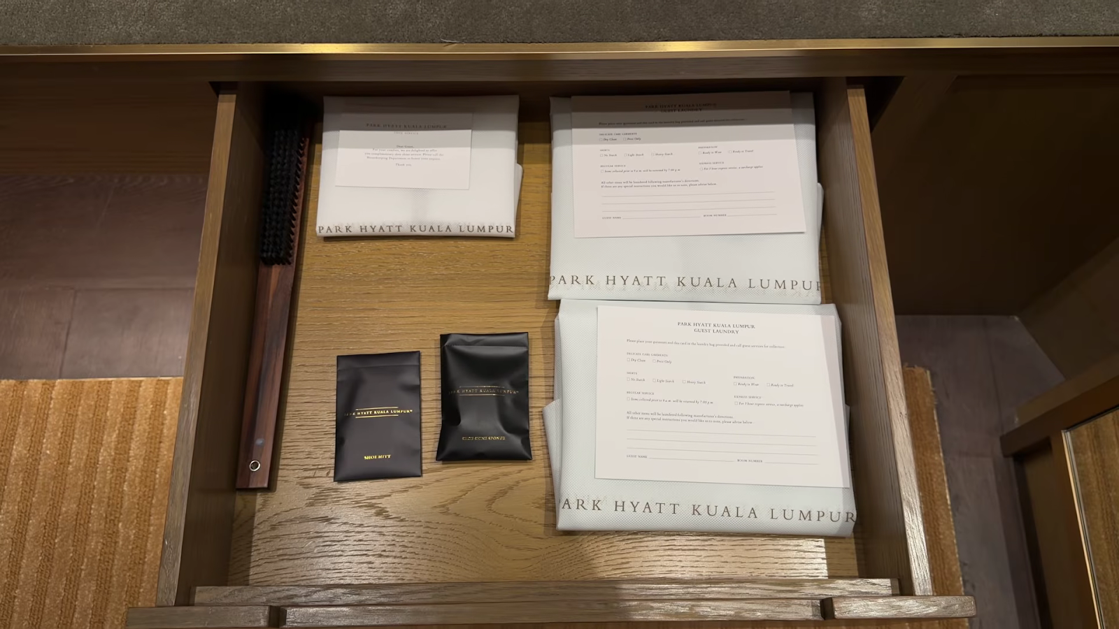 Turndown service had some highlights. We received small chocolates and, most memorably, a beautifully crafted paper fan branded with "Park Hyatt Kuala Lumpur" that folded out to reveal an intricate design. It drew comparisons to the kind of touch you might expect at a Mandarin Oriental, and it really caught us off guard. We ended up leaving it for the next guest, being carry-on only travellers, but it was a lovely piece of craft. The turndown fell short in other ways, though: no slippers brought out, no bedside mats, and water bottles simply placed by the bedside as the main gesture. Coming directly from the Banyan Tree, where turndown was a full sensory ritual, the contrast was noticeable. The chocolates and fan show the potential there.