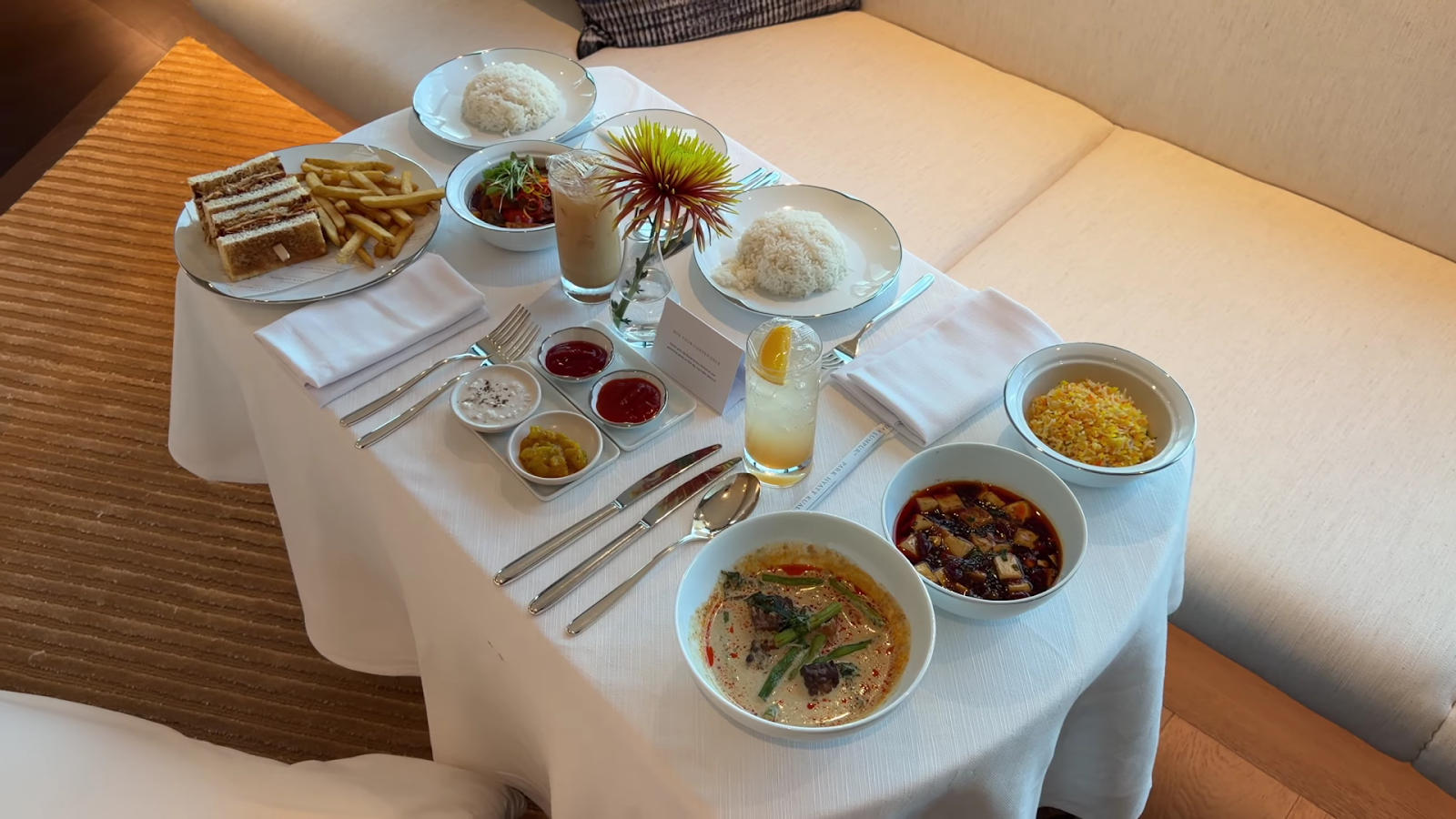 We ordered dinner from the Park Lounge rather than using the in-room menu, which offers a much more interesting selection. Malaysian tempeh and tofu curry, mapo tofu (one of our favorite dishes in the world), biryani, vegetable Jalfrezi, tofu katsu sando (egg and mayo removed on request), and two mocktails, yuzu and coconut. The total was 340 Ringgit, fully covered by our property credit with change to spare. Everything was delicious, with the mapo tofu and katsu sando particular highlights.