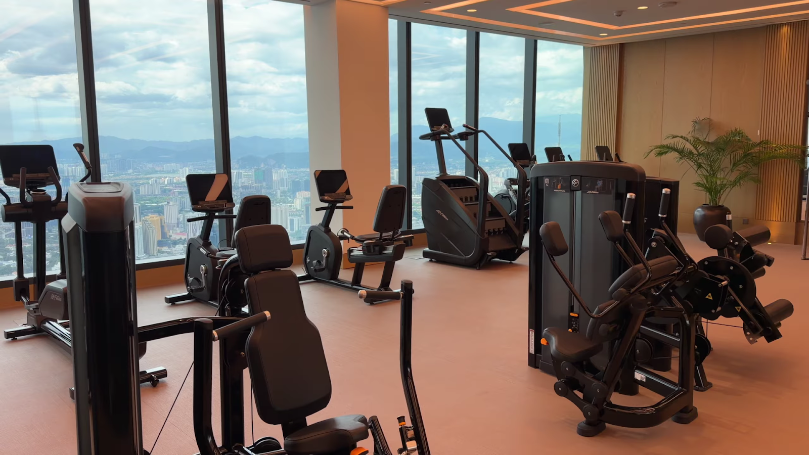 Not a massive gym, but very well equipped for its size and thoroughly enjoyable given the 99th floor setting. Shoulder press, chest press, abdominal crunch, seated leg curl and extension machines, cable station, three benches, dumbbells to 25 kilograms, and a squat rack/smith machine. All cardio equipment lined up along the windows with the same view as the rooms. We gave it a 5 out of 5. We could stay here a full week and not feel limited.